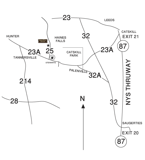 From Fallsburg/Woodbourne: Rte 42 north till end, left on Rte 55 NW till Curry, right on Rte 19 which becomes Rte 47 till end (Big Indian), right on Rte 28 till Phoenicia, left on Rte 214 till end (Hunter), right on 23A approx 5 miles, left on Rte 25 (Stewarts Gas Station) - ¼ mile up on left.